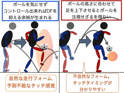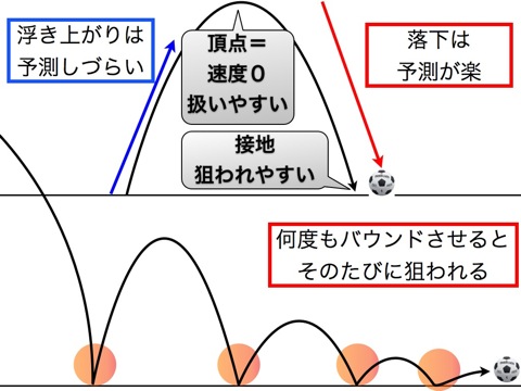 「ボールを弾ませるな」というのは単に浮き球の処理に時間をかけるなということではなく、何度も守備者にアタックのチャンスを与えるなということです。逆にしっかりとDFとの間に体を入れてボールを守れていれば、何度弾ませても構いません。むしろそうすることでDFを惹き付け、次の機会に高い位置でタッチしてDFを出し抜くことも可能です。全ては浮き球の処理の駆け引きを体得しているかどうかにかかっています。