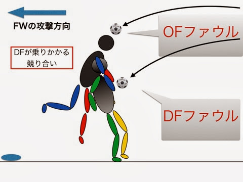 これは本当に微妙なラインですが、背中押しに対してDFが上に乗り上げるようにジャンプして競り合うシーンです。これはボールへの関与によって印象で判定が変わります。まぁほぼ審判の心象ですね。殆どの場合どちらが悪いとも言えません。